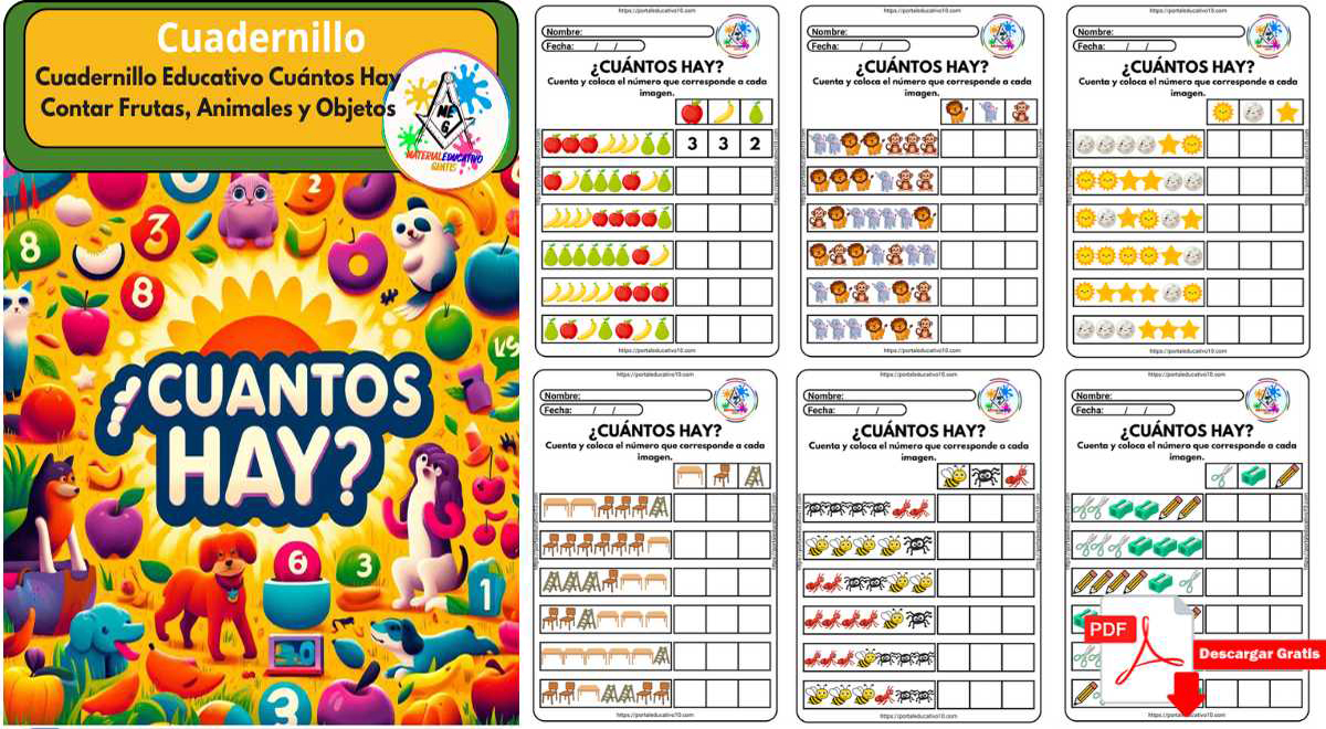 - Ejercicio de Conteo: Cada imagen viene con una pregunta clave: «¿Cuántos hay?». Los niños deben contar cuidadosamente cada grupo de ítems y escribir el número correcto en el espacio proporcionado.